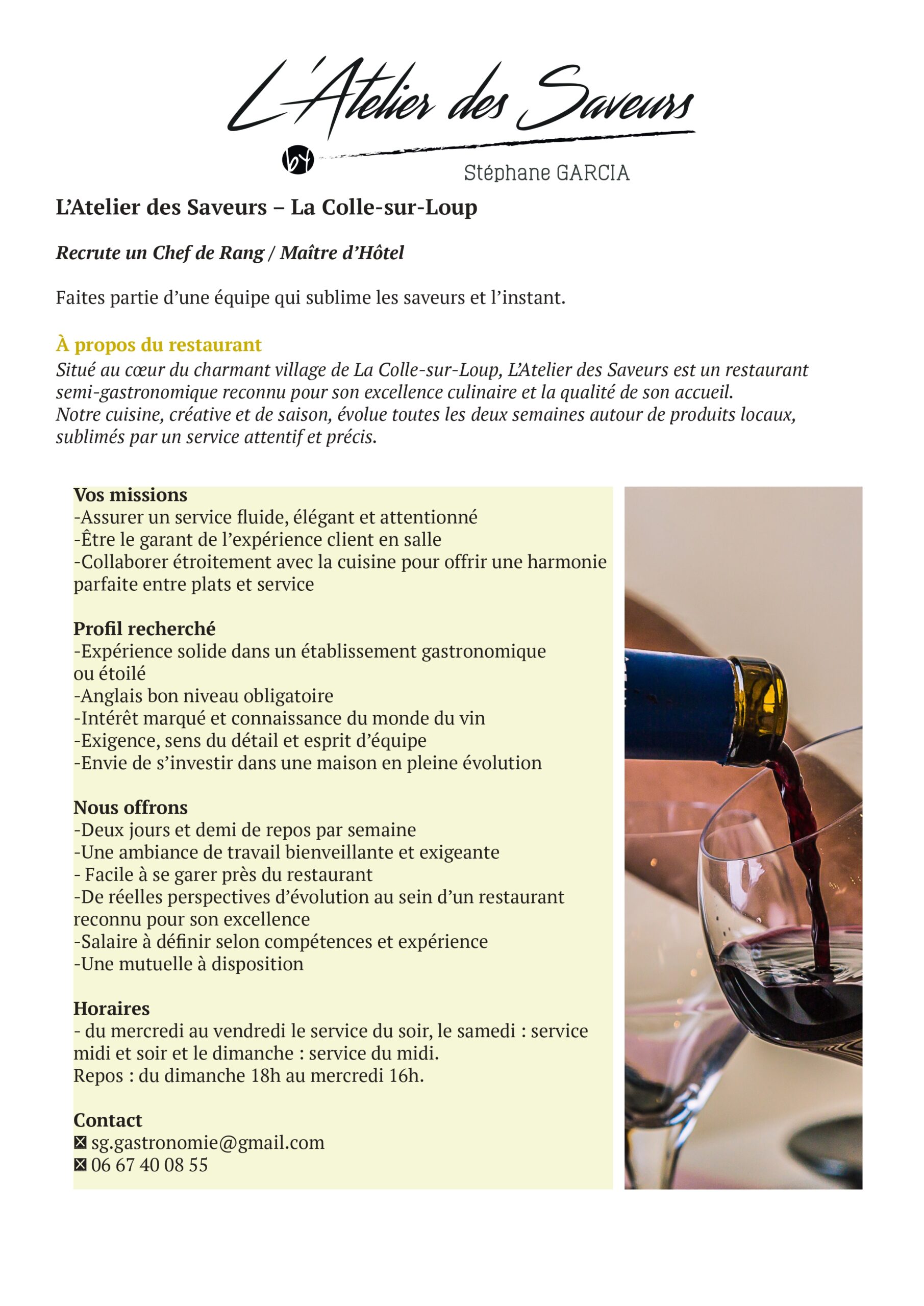 [vc_row css_animation="" row_type="row" use_row_as_full_screen_section="no" type="full_width" angled_section="no" text_align="left" background_image_as_pattern="without_pattern"][vc_column][vc_video link="https://www.youtube.com/watch?v=yFeQ7uDxbXA" align="center"][vc_column_text]L’atelier des saveurs By Stéphane Garcia – à La Colle sur loup, c’est bien plus qu’un restaurant, c’est une expérience culinaire hors du temps. Aux commandes en cuisine, le chef Stéphane Garcia, enfant d'Occitanie et du...